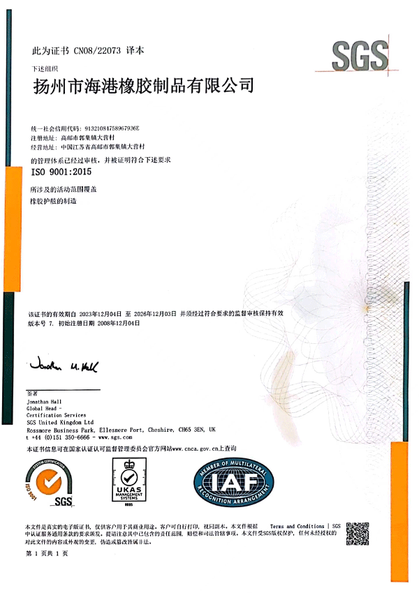揚州市海港橡膠制品有限公司位于揚州市北郊,依傍于淮江、京滬高速公路,美麗的高郵湖緊鄰我公司,風景秀麗,水、陸暢通。我公司是專業生產橡膠制品的企業,生產近二十個系列上百種規格型號的橡膠護舷、橡膠止水帶,為滿足軍用碼頭的需要,又開發了各種規格的淺灰色橡膠護舷。擁有千萬元的生產規模,力量雄厚,檢測設備齊全。